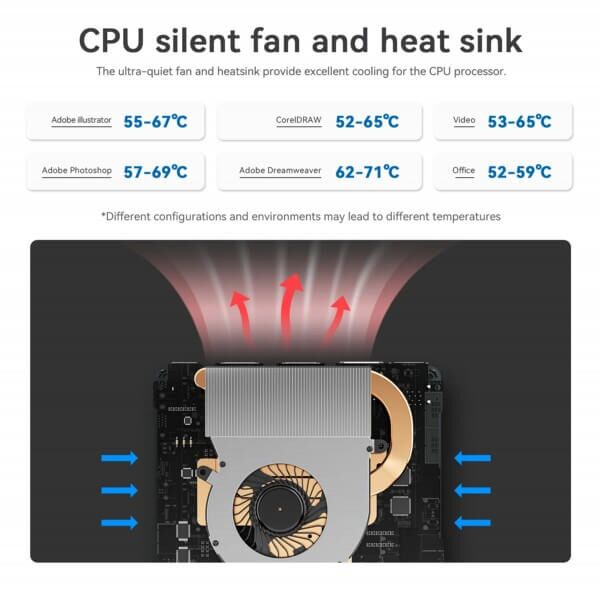 Equipped with 16GB of DDR4 RAM and a 500GB SATA3 SSD (expandable up to 2TB with a 2.5-inch NVMe/SATA3 SSD), this mini PC delivers ample storage and seamless performance, eliminating lag for smoother operations. For enhanced cooling, the device features a large, silent CPU fan, a copper heat sink, and a dedicated SSD cooling shield, improving heat dissipation by 40% and ensuring faster response times.
